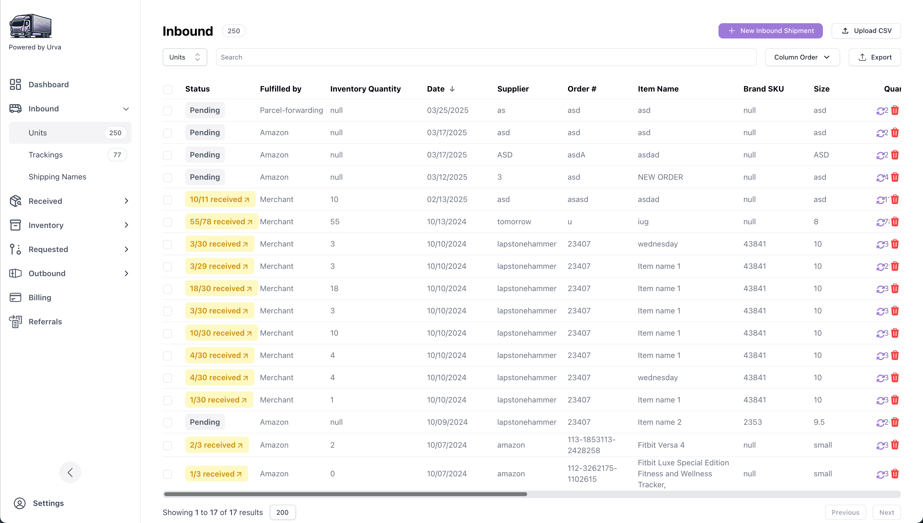 Use this button to bulk upload inbound shipments via a CSV file. Save time by uploading multiple shipments at once.