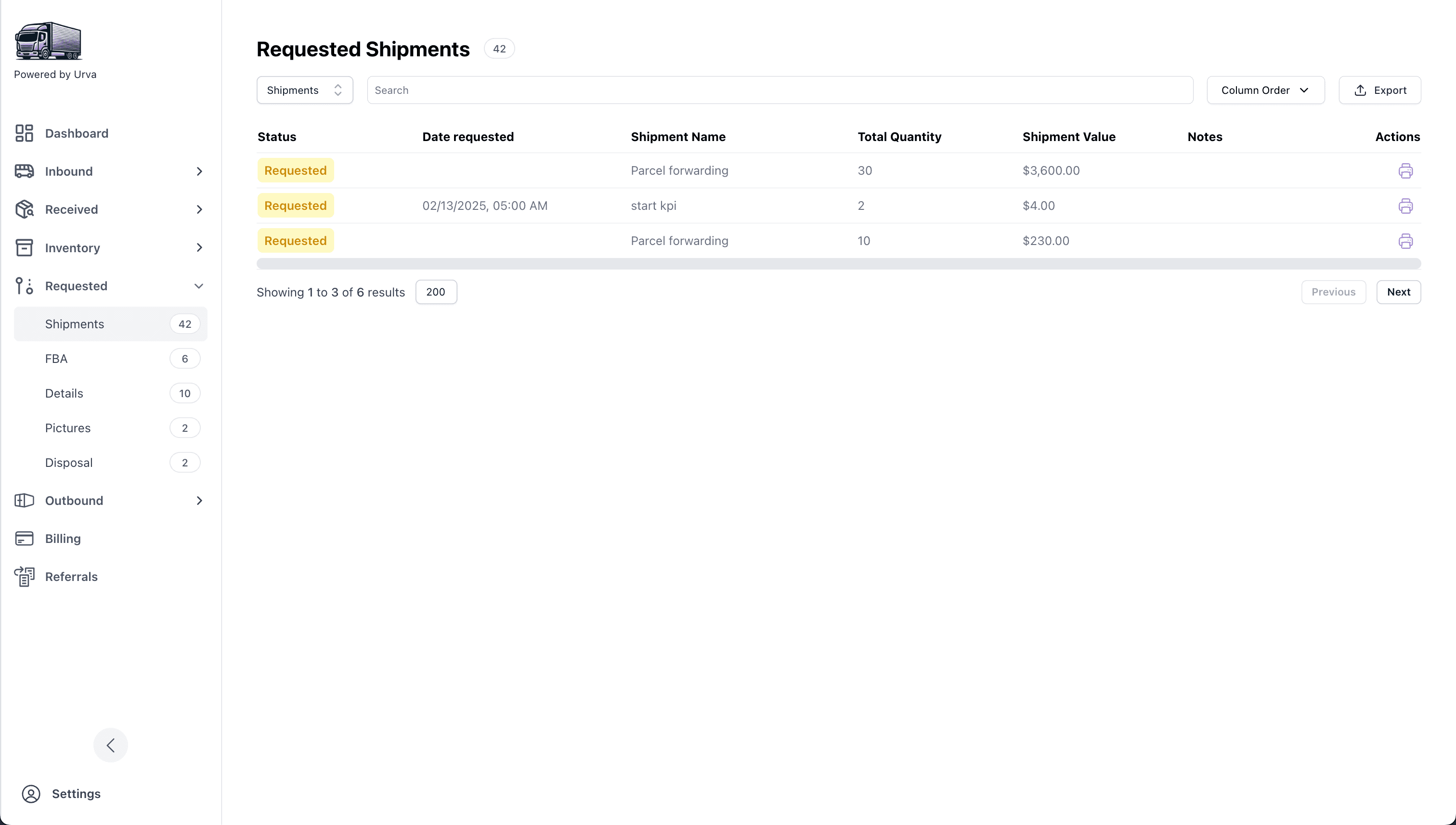 - View all of your requested merchant shipments. By clicking on each row, you'll see the shipment details. Once these shipments are shipped out by our warehouse, they will move to the outbound shipments page.